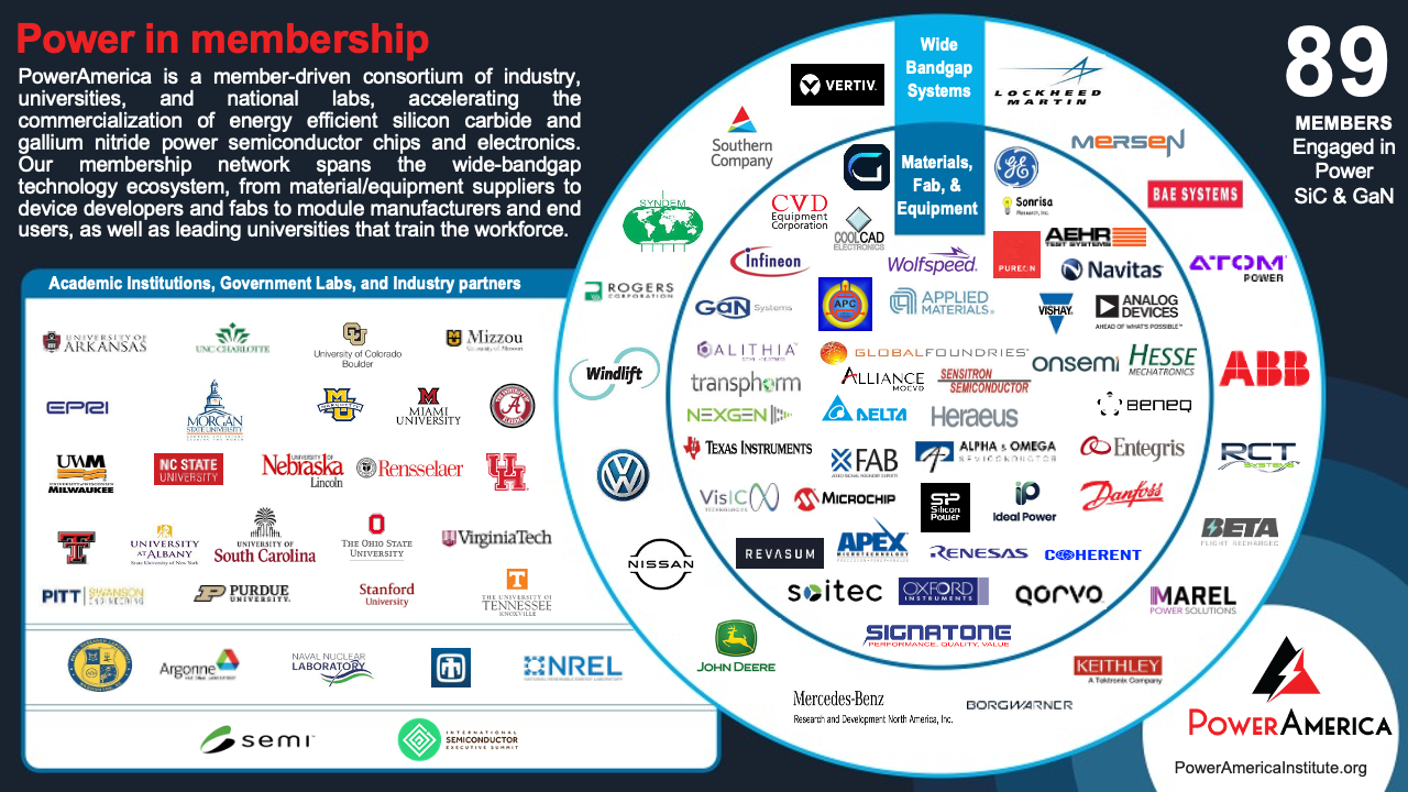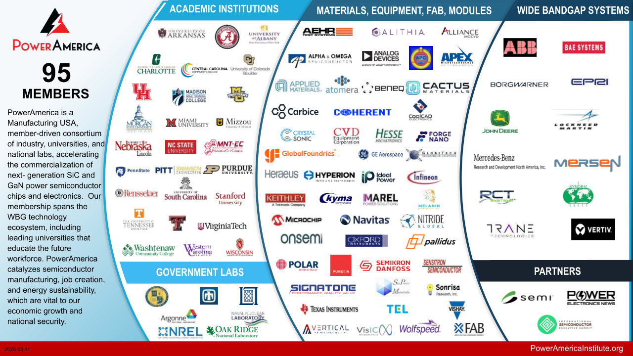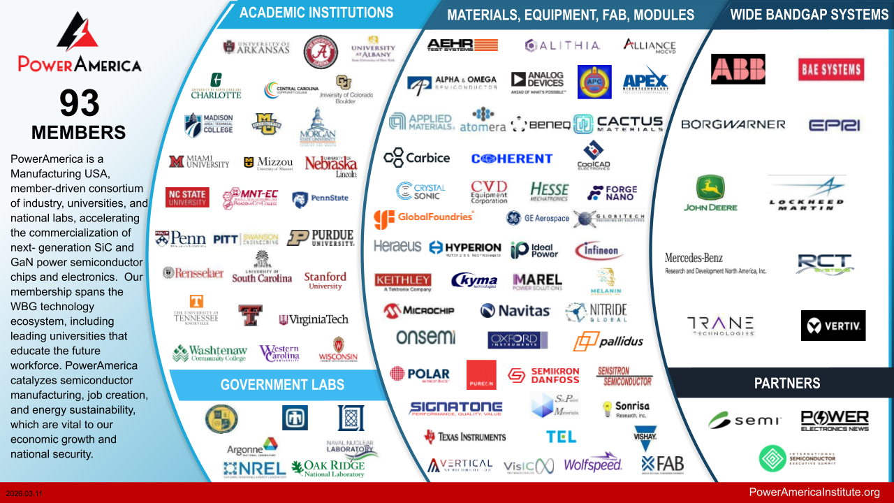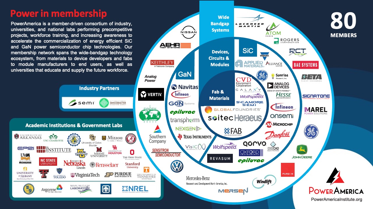PowerAmerica, a proud member of Manufacturing USA, brings together the brightest minds in the wide bandgap (WBG) semiconductor world. Semiconductor manufacturers and companies that use power semiconductors in their products are working together to accelerate the adoption of next-generation silicon carbide (SiC) and gallium nitride (GaN) power electronics.