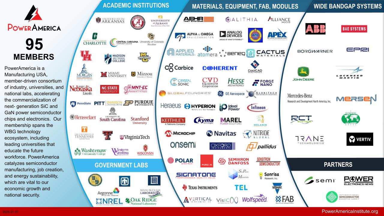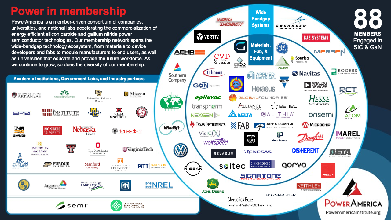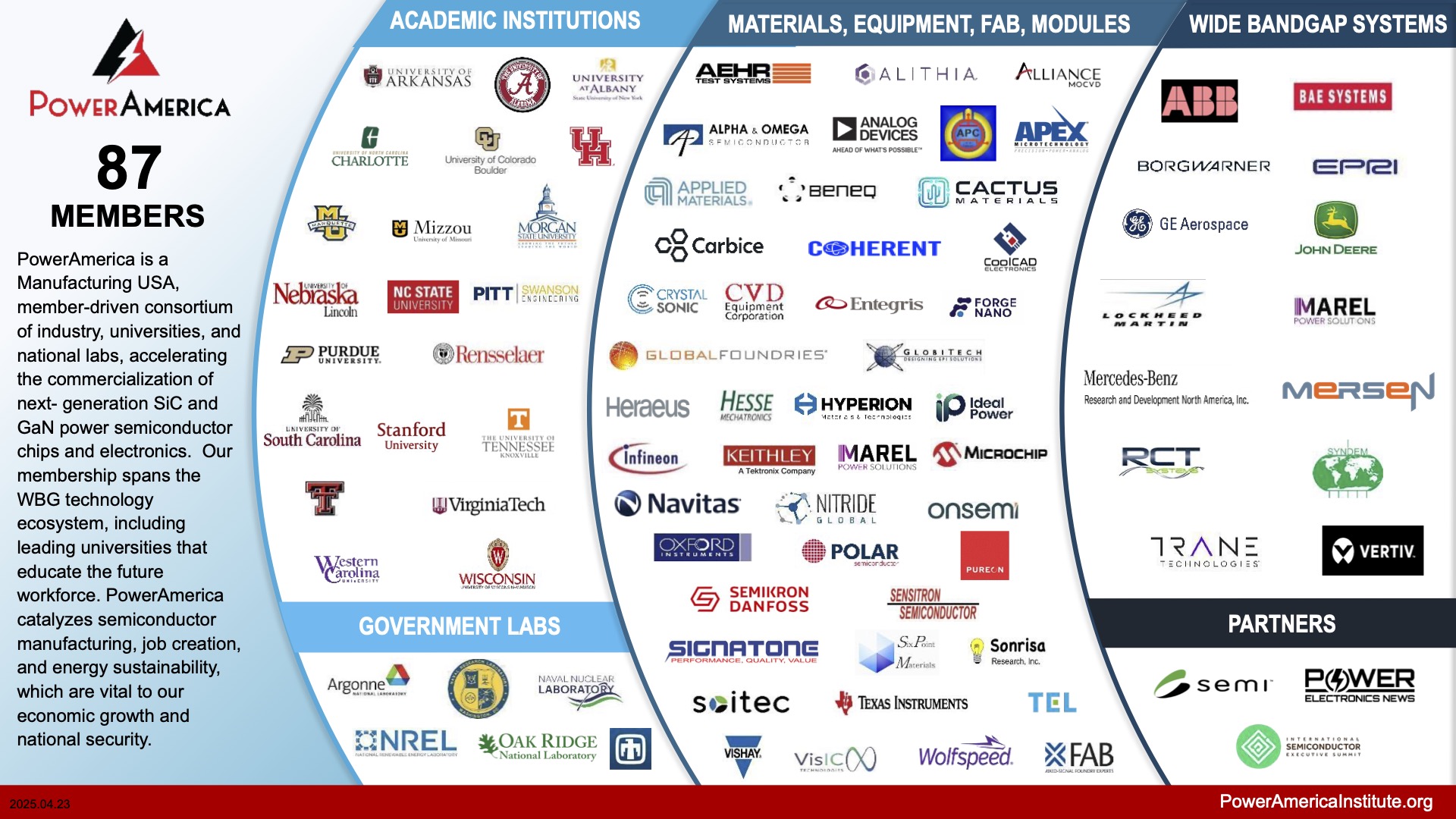 PowerAmerica, a proud member of Manufacturing USA, brings together the brightest minds in the wide bandgap (WBG) semiconductor world. Semiconductor manufacturers and companies that use power semiconductors in their products are working together to accelerate the adoption of next-generation silicon carbide (SiC) and gallium nitride (GaN) power electronics.