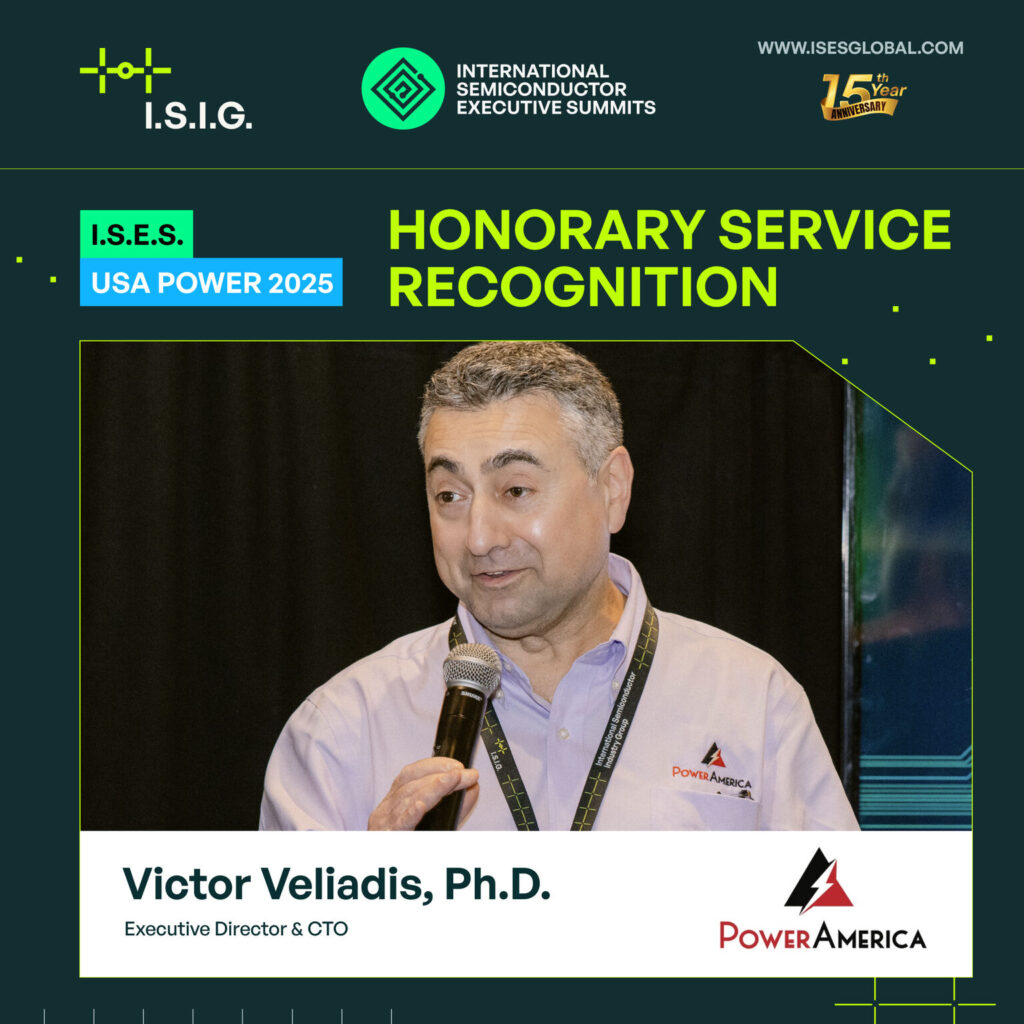 “At I.S.E.S. USA Power 2025, we were proud to present the Honorary Service Recognition to Victor Veliadis, Ph.D., Executive Director & CTO of PowerAmerica — in acknowledgment of his outstanding leadership and unwavering commitment to advancing wide-bandgap power semiconductor technologies,” the International Semiconductor Industry Group wrote in a LinkedIn post announcing the achievement.